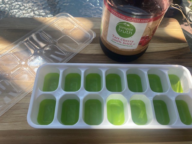 Fill a silicon ice try with your juice of choice. I had tart cherry juice (and LOVE it) so that’s what I used in this beverage. You will need to let these freeze over night.