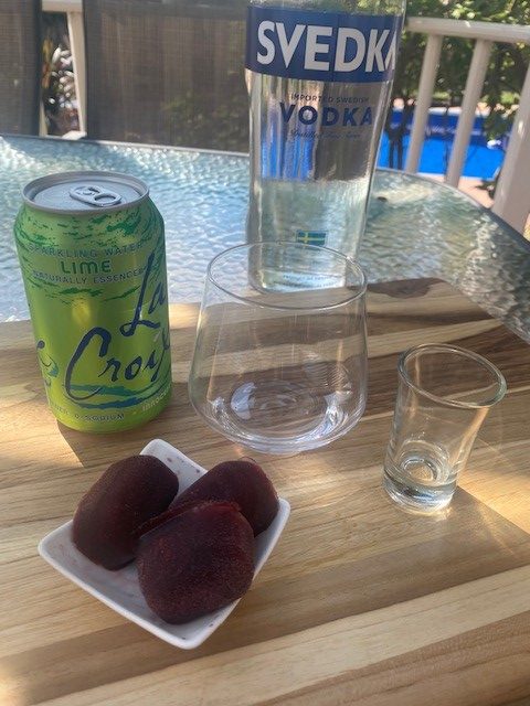 This is a super fun twist on the standard vodka soda. Freeze your favorite fruit juice in ice trays and make this simple cocktail something special! I love this hack with fruit juice. Use bottled or fresh and this prolongs the life of your juice. Plus, you can use these cubes in all sorts of cocktails. I’ll show you more in another post sometime!