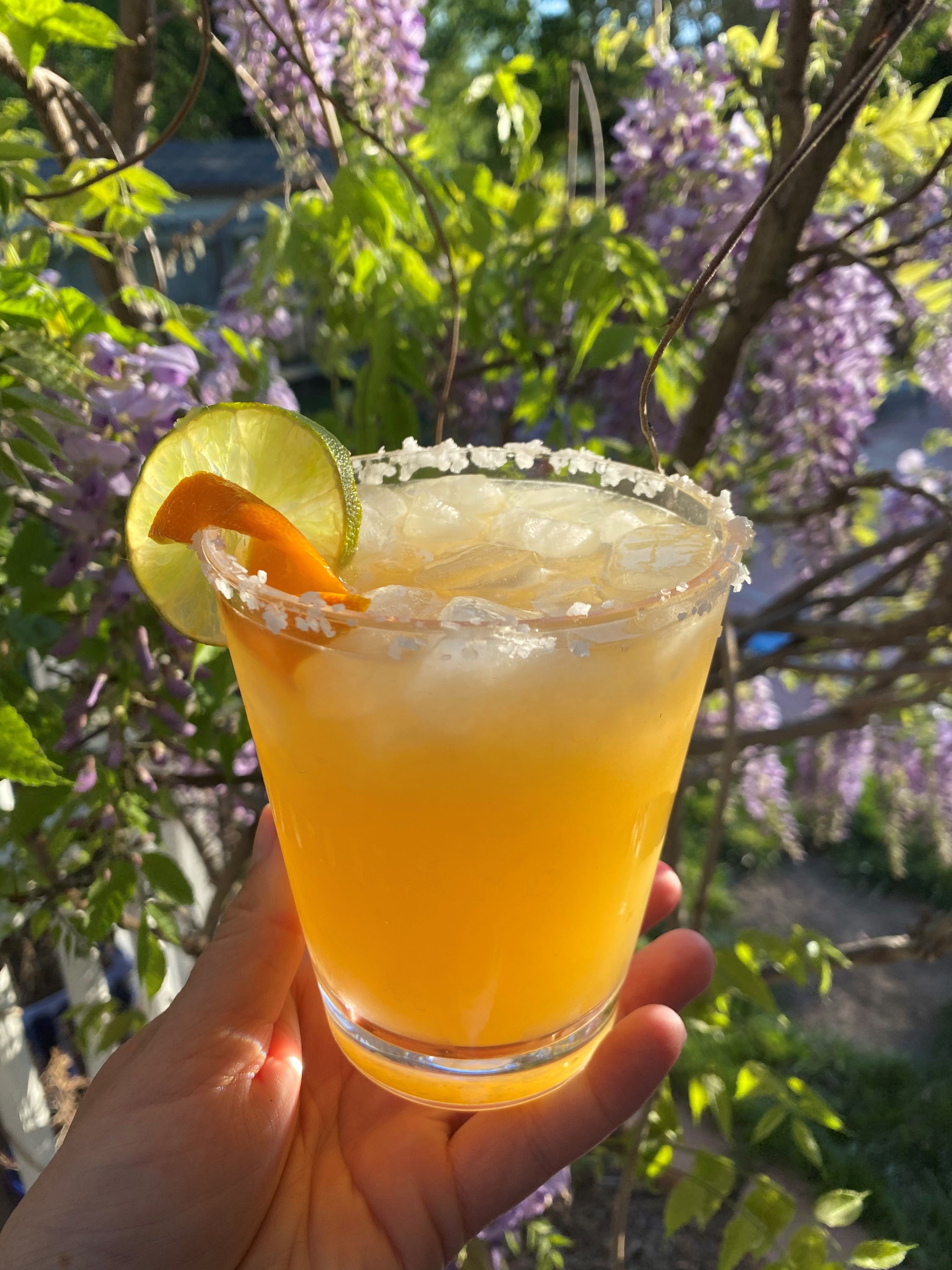 Combine all the ingredients with ice into a shaker and shake vigorously. Rim glass with lime juice and salt. Fill glass with ice and strain contents of shaker over ice. Garnish with a lime wheel and orange zest.